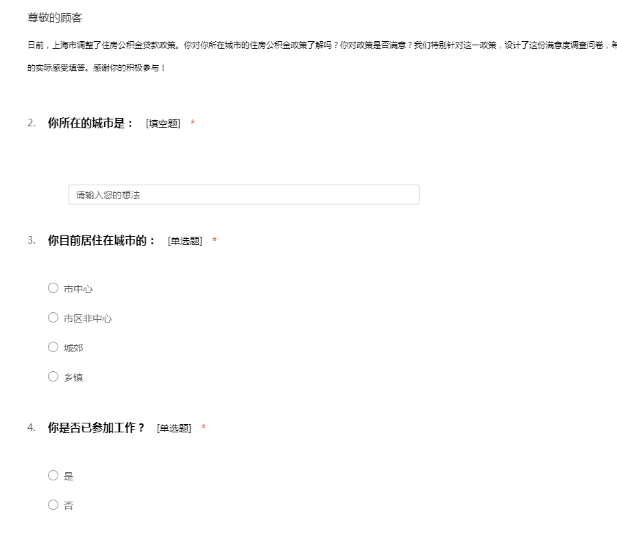 日前,上海市调整了住房公积金贷款政策。你对你所在城市的住房公积金政策了解吗?你对政策是否满意?我们特别针对这一政策,设计了这份满意度调查问卷,希望能够听到大家的建议。问卷不记名,请根据你的实际感受填答。感谢你的积极参与!