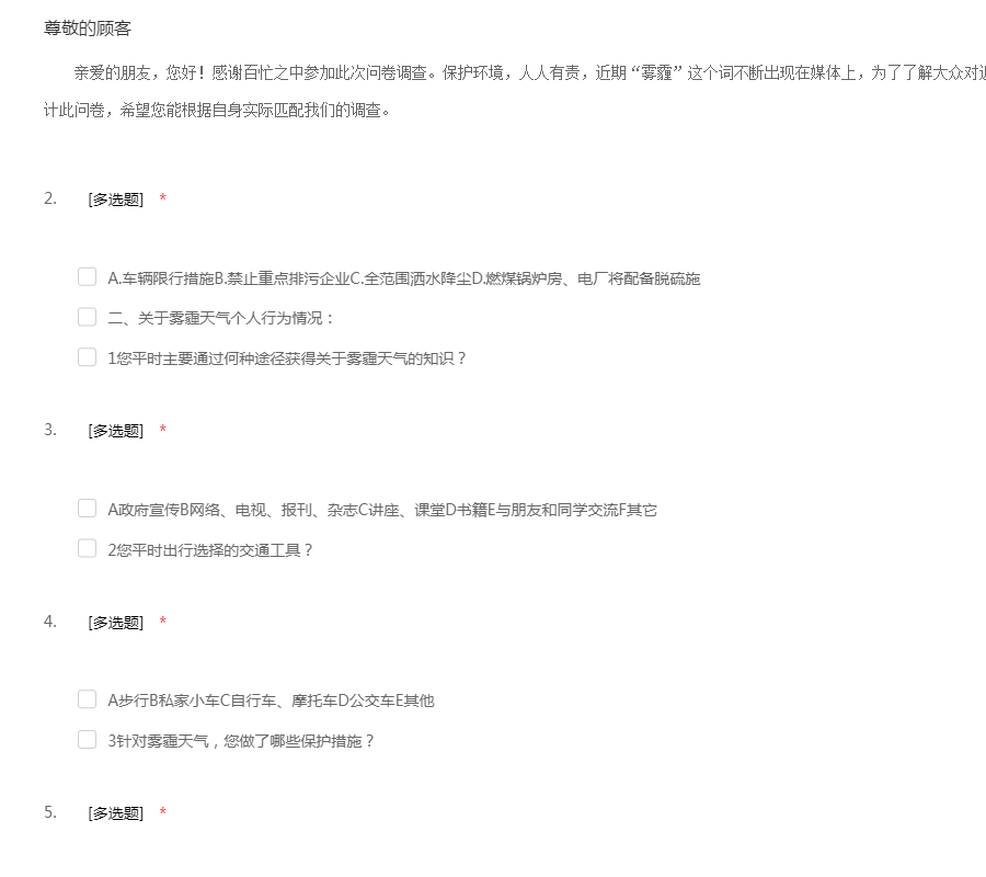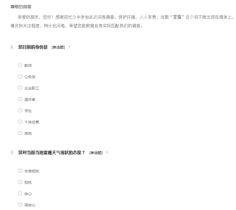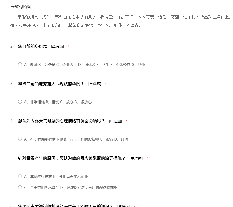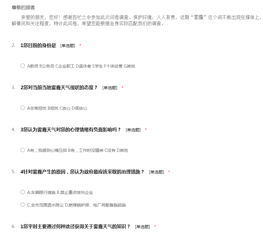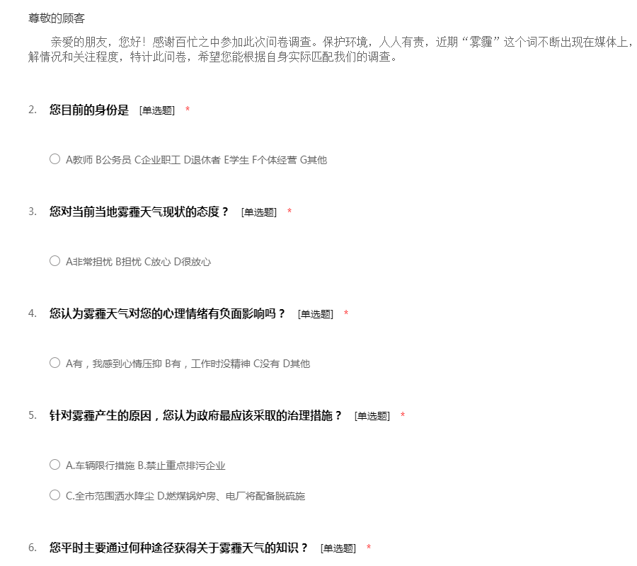 亲爱的朋友,您好!感谢百忙之中参加此次问卷调查。保护环境,人人有责,近期“雾霾”这个词不断出现在媒体上,为了了解大众对近期雾霾天气的了解情况和关注程度,特计此问卷,希望您能根据自身实际匹配我们的调查。