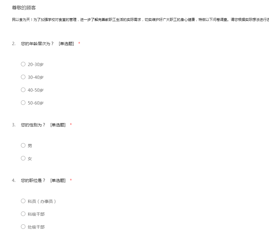 民以食为天!为了加强学校对食堂的管理,进一步了解完善教职工生活的实际需求,切实维护好广大职工的身心健康,特做以下问卷调查。请您根据实际想法进行选择、填写,感谢您的配合!