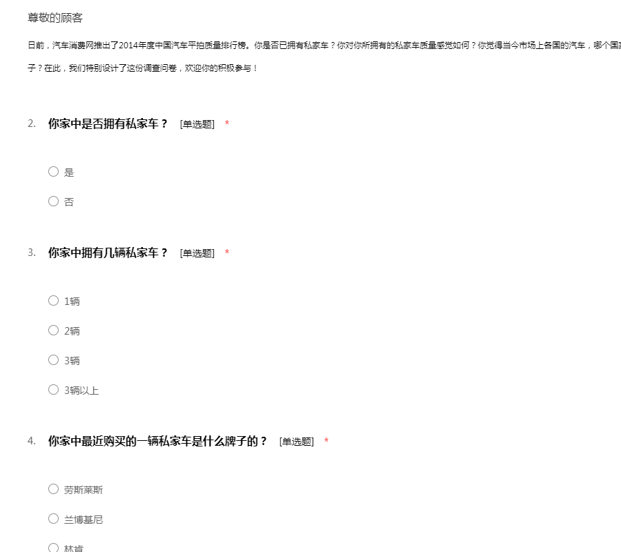 日前,汽车消费网推出了2014年度中国汽车平拍质量排行榜。你是否已拥有私家车?你对你所拥有的私家车质量感觉如何?你觉得当今市场上各国的汽车,哪个国家的车子质量会比较好?你更喜欢哪个国家的车子?在此,我们特别设计了这份调查问卷,欢迎你的积极参与!