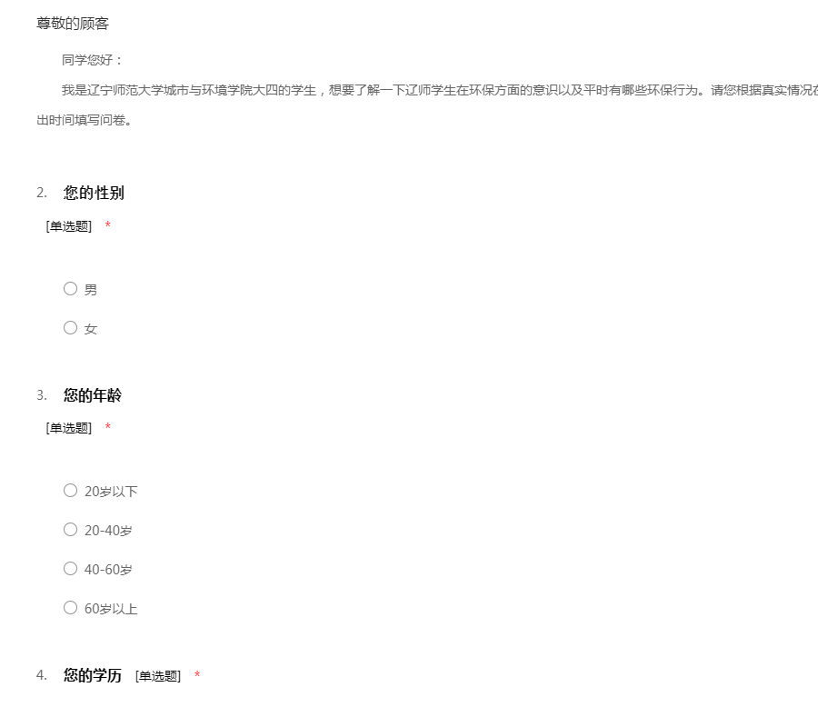 同学您好: 我是辽宁师范大学城市与环境学院大四的学生,想要了解一下辽师学生在环保方面的意识以及平时有哪些环保行为。请您根据真实情况在下列选项中打√,感谢您能在百忙之中抽出时间填写问卷。