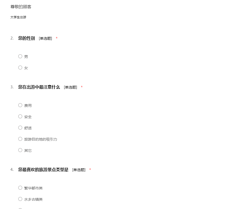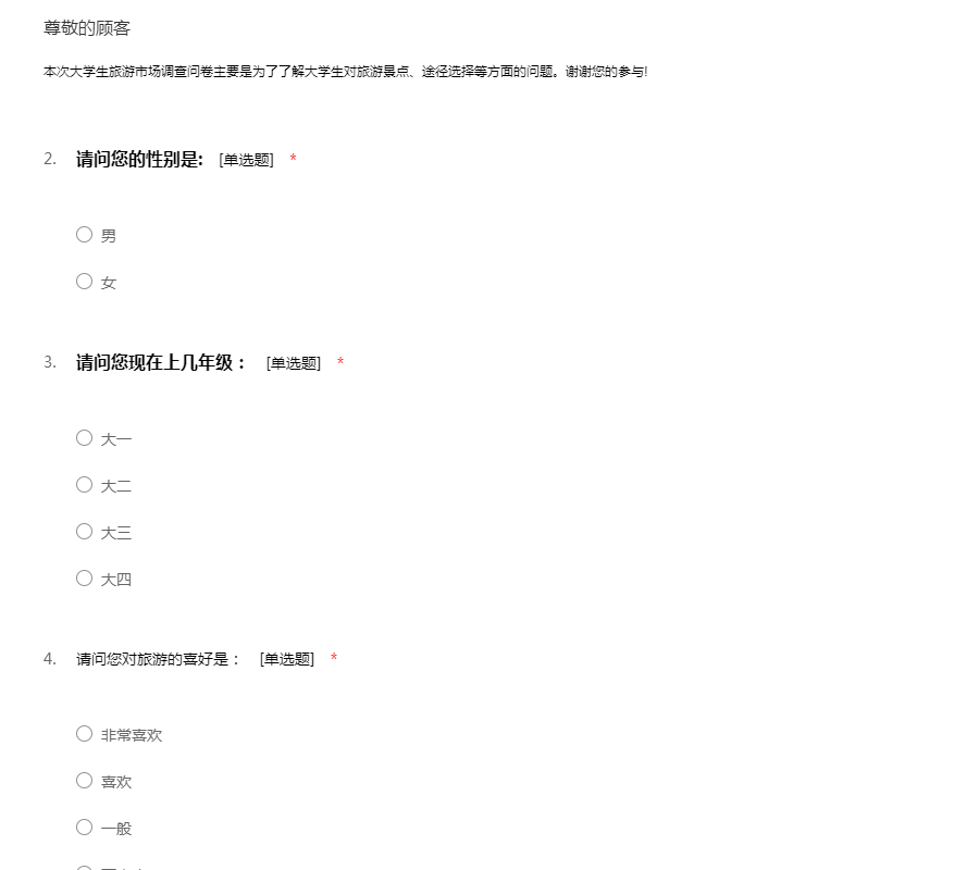 本次大学生旅游市场调查问卷主要是为了了解大学生对旅游景点、途径选择等方面的问题。谢谢您的参与!