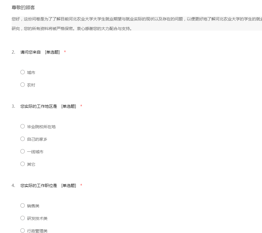 您好,这份问卷是为了了解目前河北农业大学大学生就业期望与就业实际的现状以及存在的问题,以便更好地了解河北农业大学的学生的就业问题,这次调查的所有数据仅用于学术研究,您的所有资料将被严格保密。衷心感谢您的大力配合与支持。