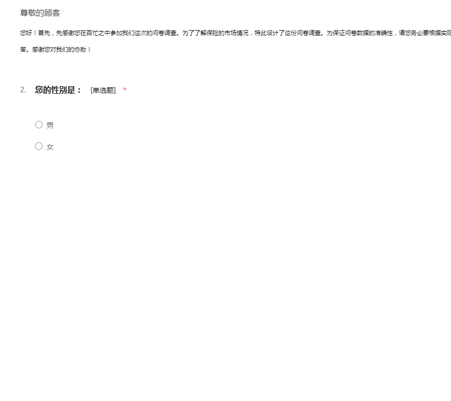 您好!首先,先感谢您在百忙之中参加我们这次的问卷调查。为了了解保险的市场情况,特此设计了这份问卷调查。为保证问卷数据的准确性,请您务必要根据实际情况来填写。问卷采用你明知,所以请放心填答。感谢您对我们的协助!