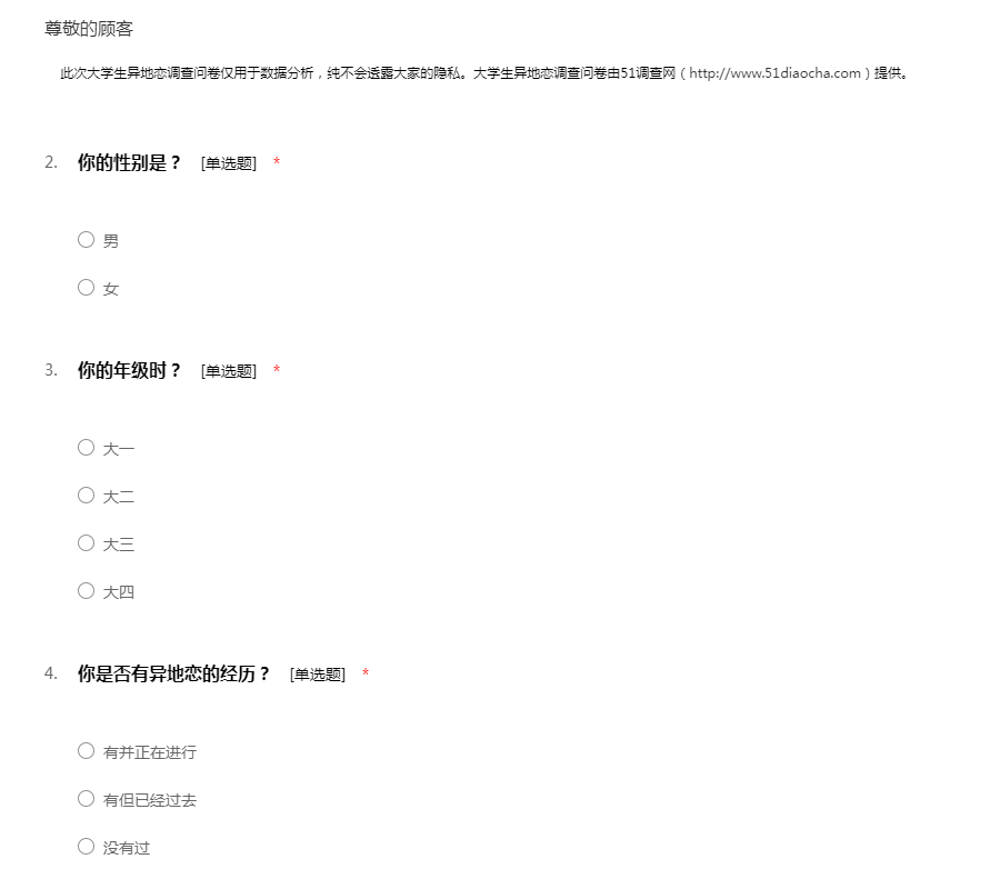 此次大学生异地恋调查问卷仅用于数据分析,纯不会透露大家的隐私。大学生异地恋调查问卷由51调查网(http://www.51diaocha.com)提供。