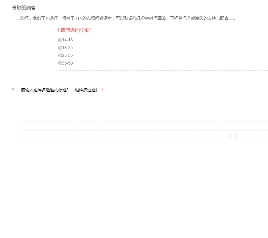 您好,我们正在进行一项关于KTV的市场问卷调查,可以耽误您几分钟时间回答一下问卷吗?感谢您的支持与配合…… 1.请问您的年龄* 14-18 18-25 25-35 35-50