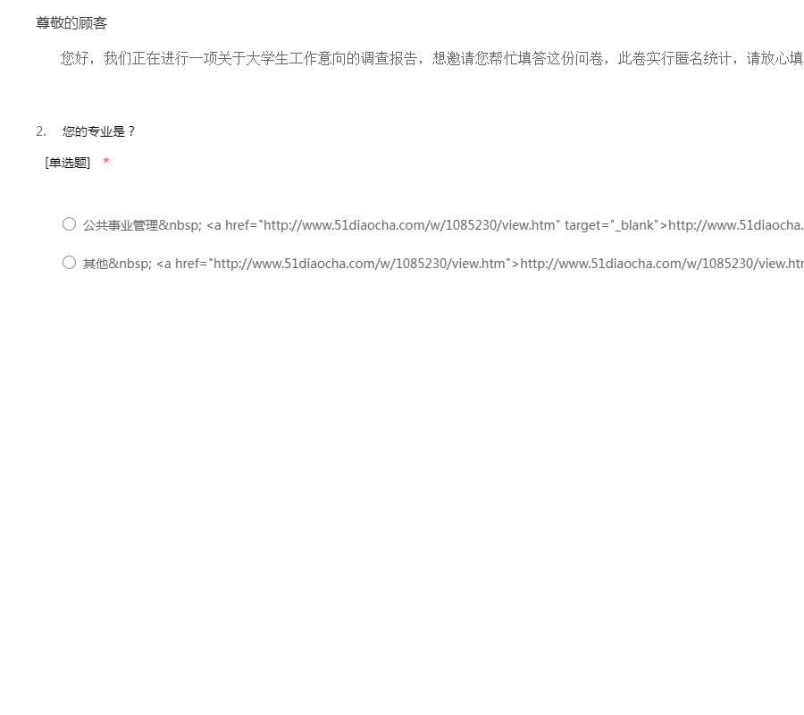 您好,我们正在进行一项关于大学生工作意向的调查报告,想邀请您帮忙填答这份问卷,此卷实行匿名统计,请放心填写,感谢您的帮助。