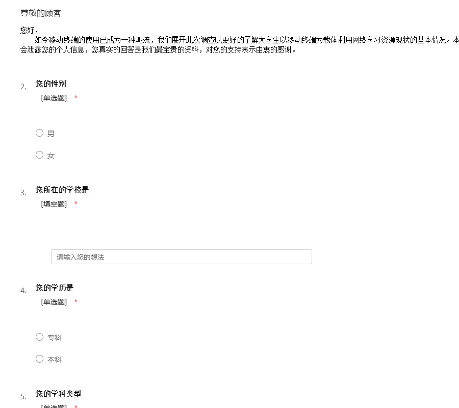 您好, 如今移动终端的使用已成为一种潮流,我们展开此次调查以更好的了解大学生以移动终端为载体利用网络学习资源现状的基本情况。本次问卷收集数据仅供调查分析使用,绝不会泄露您的个人信息,您真实的回答是我们最宝贵的资料,对您的支持表示由衷的感谢。