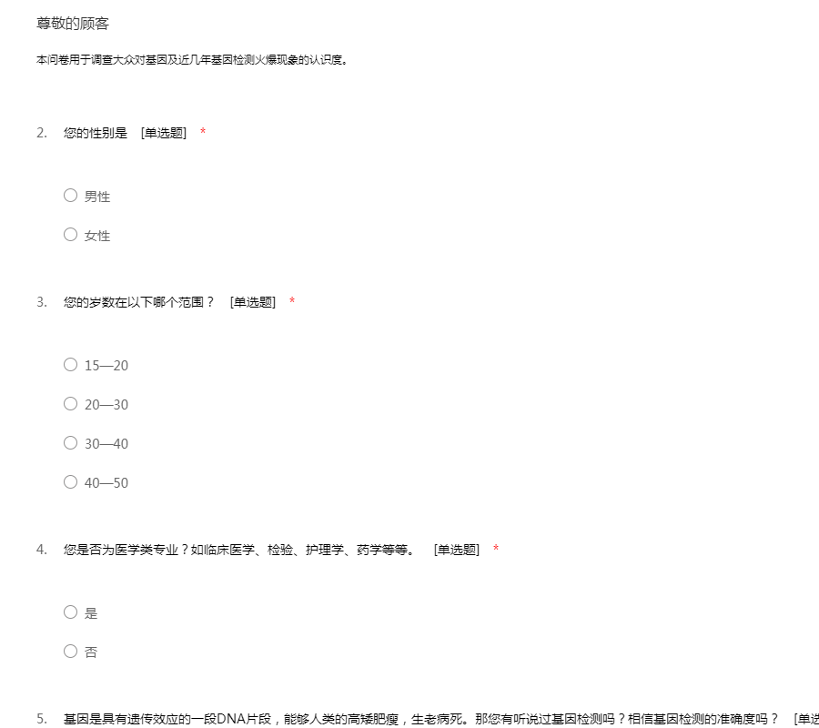 本问卷用于调查大众对基因及近几年基因检测火爆现象的认识度。