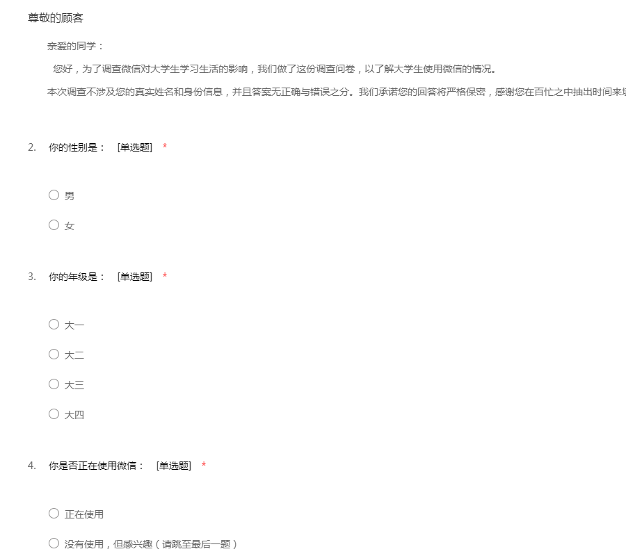 亲爱的同学: 您好,为了调查微信对大学生学习生活的影响,我们做了这份调查问卷,以了解大学生使用微信的情况。 本次调查不涉及您的真实姓名和身份信息,并且答案无正确与错误之分。我们承诺您的回答将严格保密,感谢您在百忙之中抽出时间来填写这一份问卷,感谢您的协助与支持。