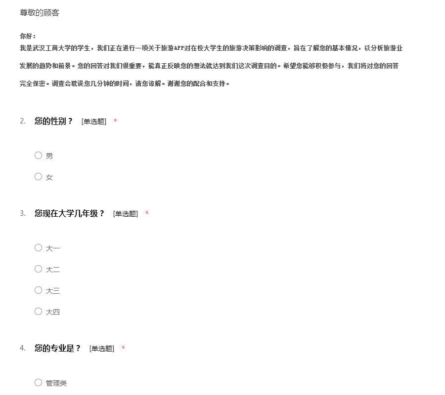你好: 我是武汉工商大学的学生,我们正在进行一项关于旅游APP对在校大学生的旅游决策影响的调查,旨在了解您的基本情况,以分析旅游业发展的趋势和前景。您的回答对我们很重要,能真正反映您的想法就达到我们这次调查目的。希望您能够积极参与,我们将对您的回答完全保密。调查会耽误您几分钟的时间,请您谅解。谢谢您的配合和支持。