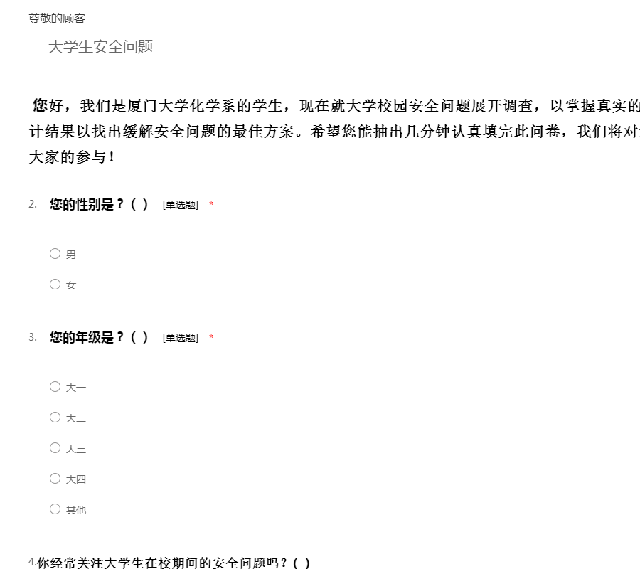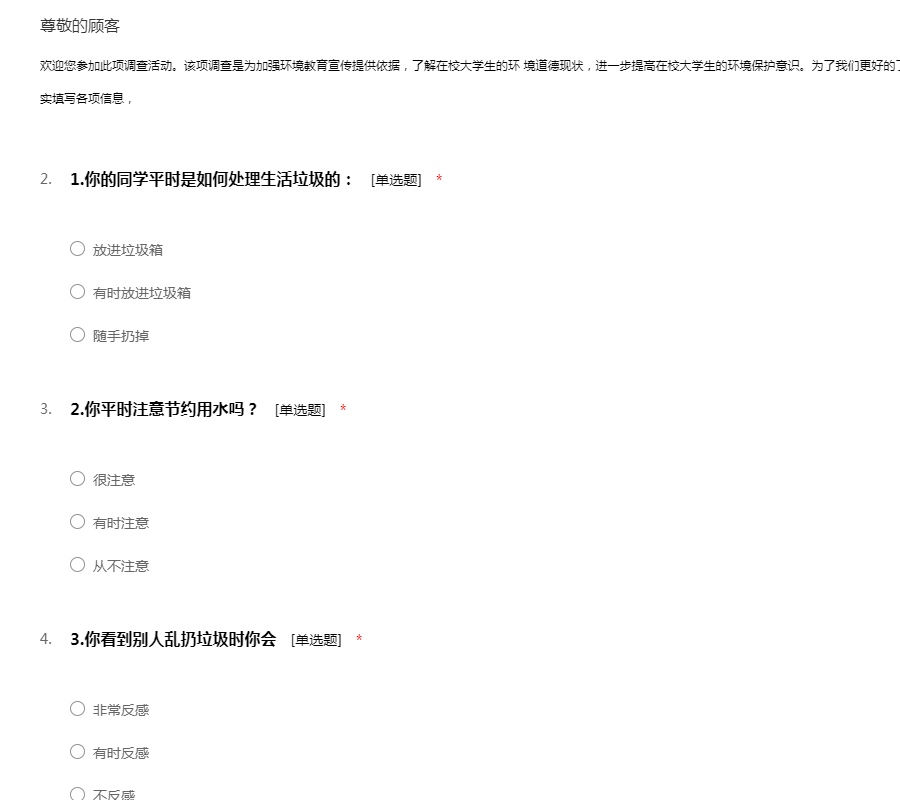 欢迎您参加此项调查活动。该项调查是为加强环境教育宣传提供依据,了解在校大学生的环 境道德现状,进一步提高在校大学生的环境保护意识。为了我们更好的了解情况,更好的为您的生活环境 服务。请您如实填写各项信息,