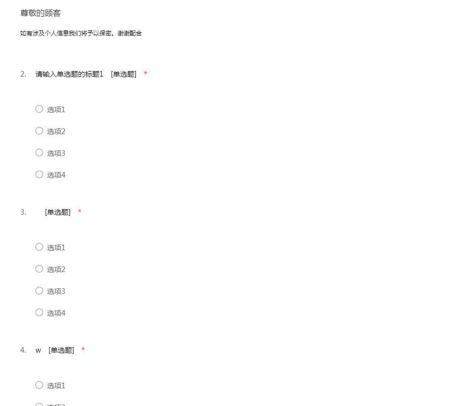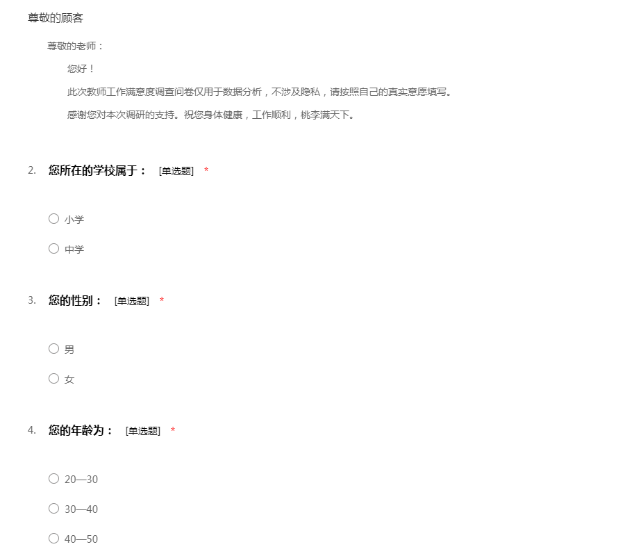 尊敬的老师: 您好! 此次教师工作满意度调查问卷仅用于数据分析,不涉及隐私,请按照自己的真实意愿填写。 感谢您对本次调研的支持。祝您身体健康,工作顺利,桃李满天下。