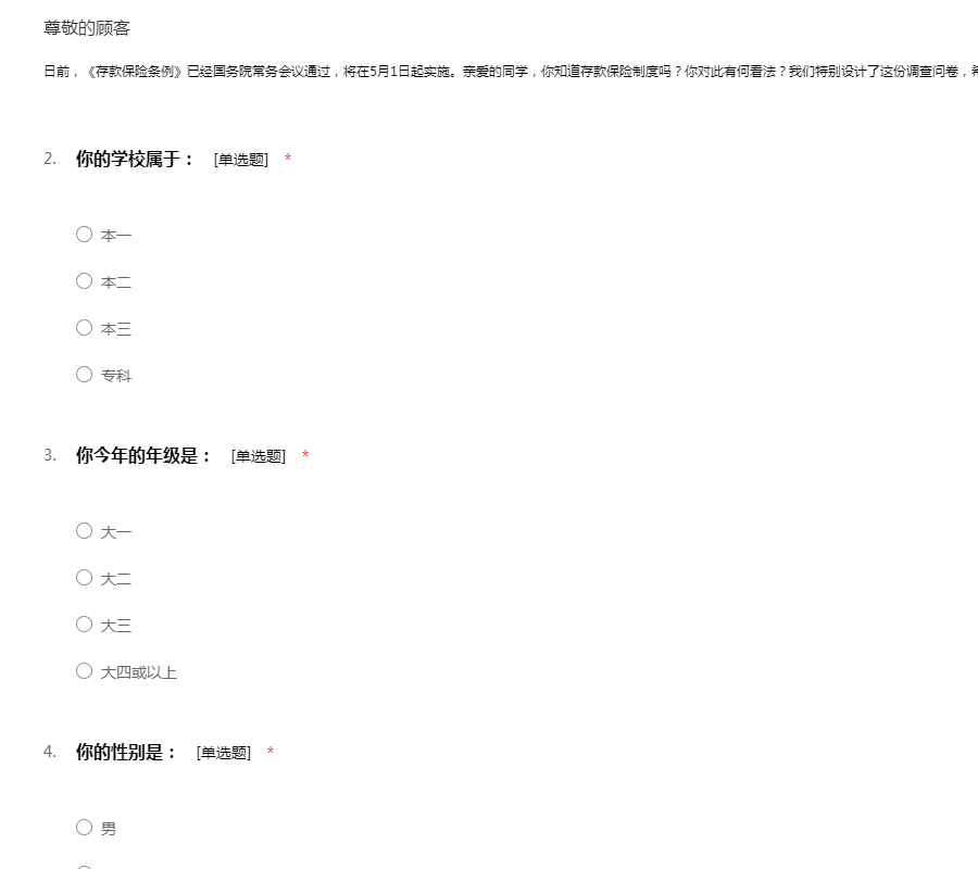 日前,《存款保险条例》已经国务院常务会议通过,将在5月1日起实施。亲爱的同学,你知道存款保险制度吗?你对此有何看法?我们特别设计了这份调查问卷,希望你能够积极参与!
