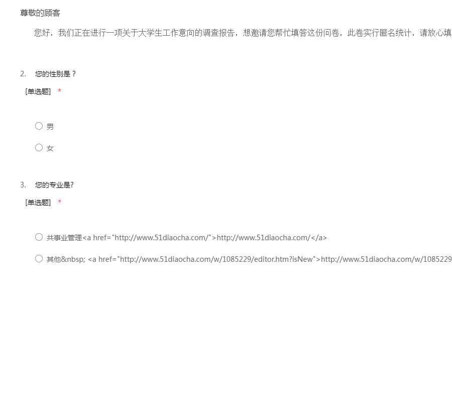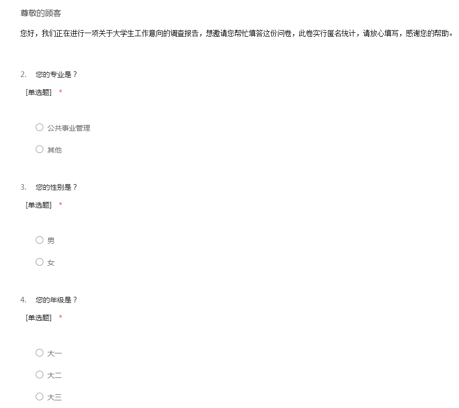 您好,我们正在进行一项关于大学生工作意向的调查报告,想邀请您帮忙填答这份问卷,此卷实行匿名统计,请放心填写,感谢您的帮助。