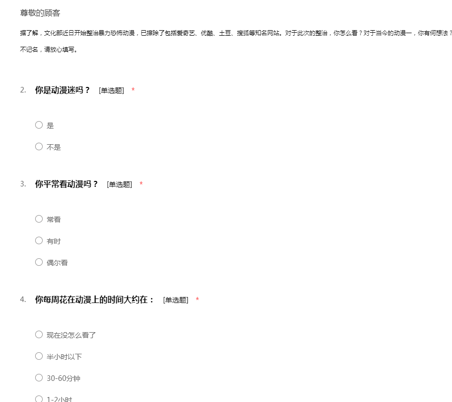 据了解,文化部近日开始整治暴力恐怖动漫,已擦除了包括爱奇艺、优酷、土豆、搜狐等知名网站。对于此次的整治,你怎么看?对于当今的动漫一,你有何想法?在此,欢迎大家前来参与我们此次的调查。问卷不记名,请放心填写。