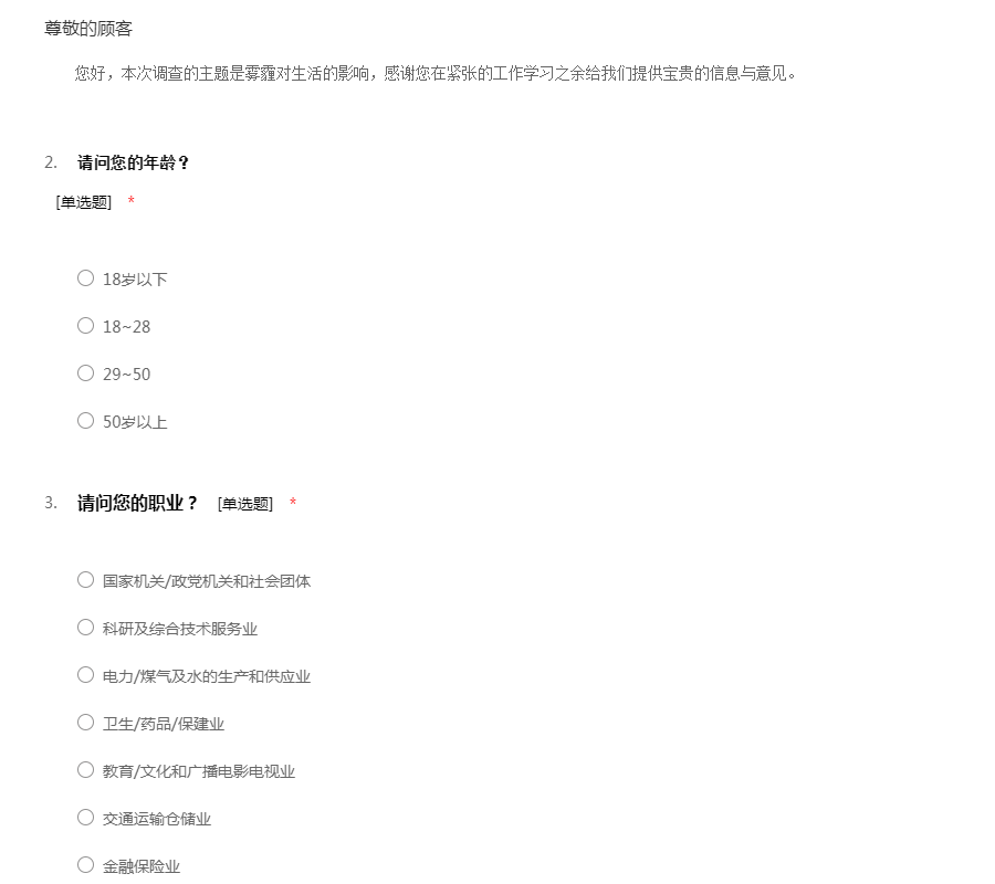 您好,本次调查的主题是雾霾对生活的影响,感谢您在紧张的工作学习之余给我们提供宝贵的信息与意见。