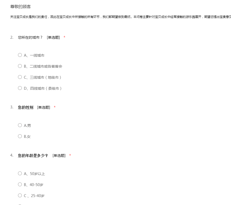 关注宝贝成长是我们的责任,因此在宝贝成长中所接触的所有环节,我们都期望做到最好。本问卷主要针对宝贝成长中经常接触的游乐园展开,期望您提出宝贵意见。