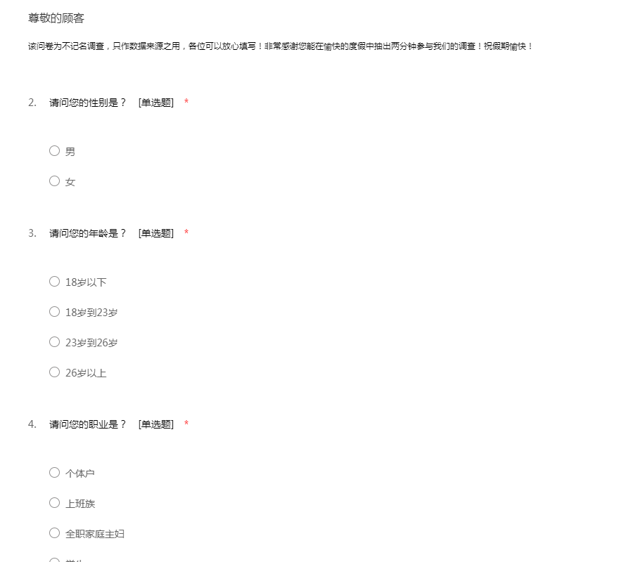 该问卷为不记名调查,只作数据来源之用,各位可以放心填写!非常感谢您能在愉快的度假中抽出两分钟参与我们的调查!祝假期愉快!