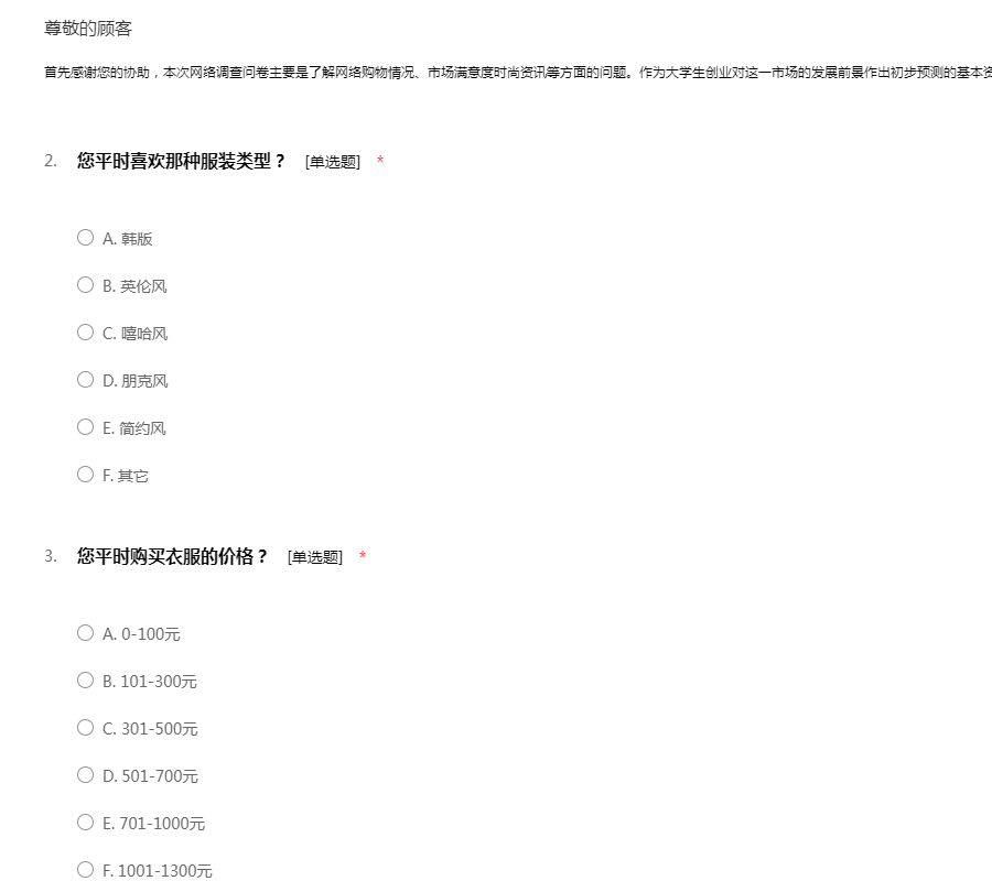 首先感谢您的协助,本次网络调查问卷主要是了解网络购物情况、市场满意度时尚资讯等方面的问题。作为大学生创业对这一市场的发展前景作出初步预测的基本资料。耽误了您的宝贵时间,望请见谅。
