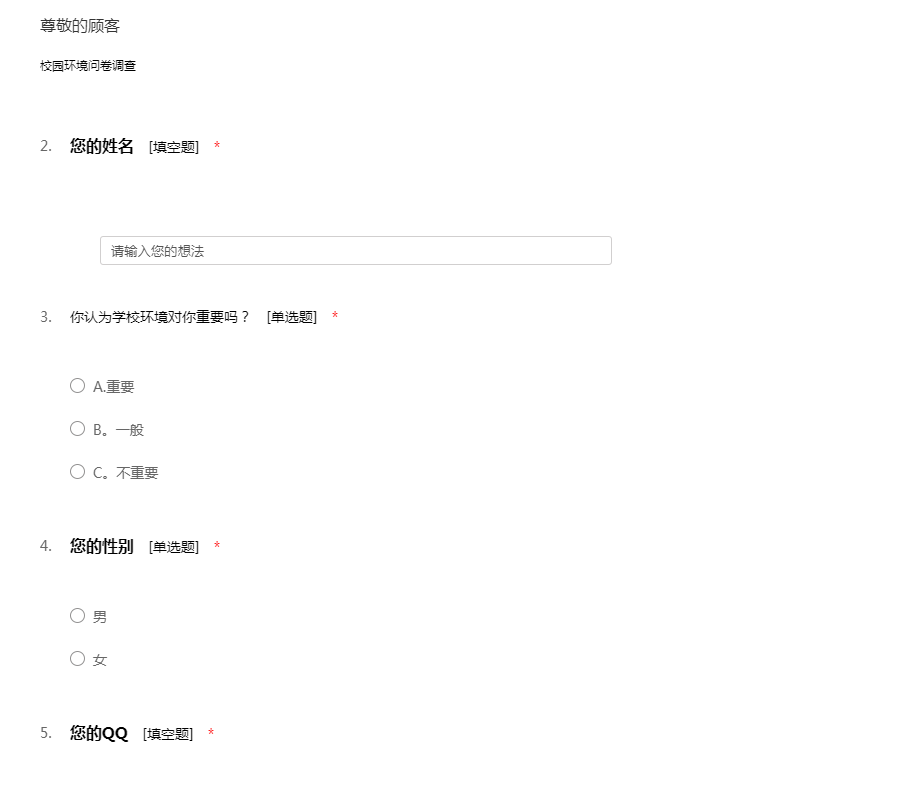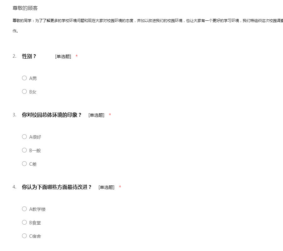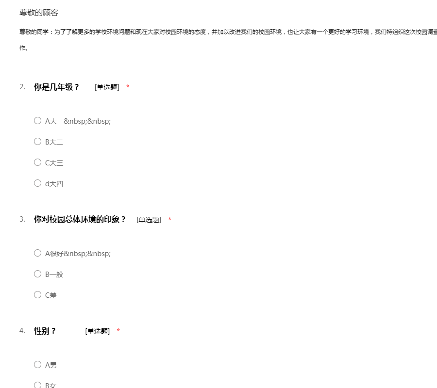 尊敬的同学:为了了解更多的学校环境问题和现在大家对校园环境的态度,并加以改进我们的校园环境,也让大家有一个更好的学习环境,我们特组织这次校园调查,希望您能大力协助和支持,谢谢您的合作。