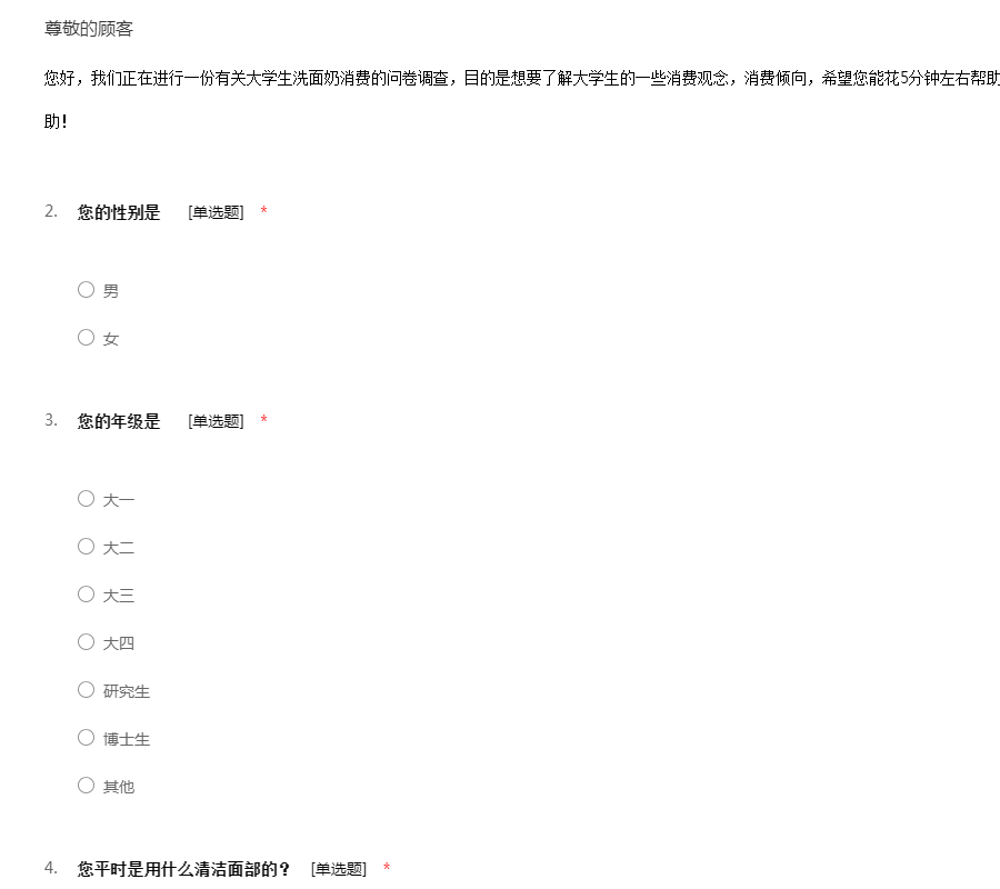 您好,我们正在进行一份有关大学生洗面奶消费的问卷调查,目的是想要了解大学生的一些消费观念,消费倾向,希望您能花5分钟左右帮助我们完成这份调查报告,非常感谢您的帮助!
