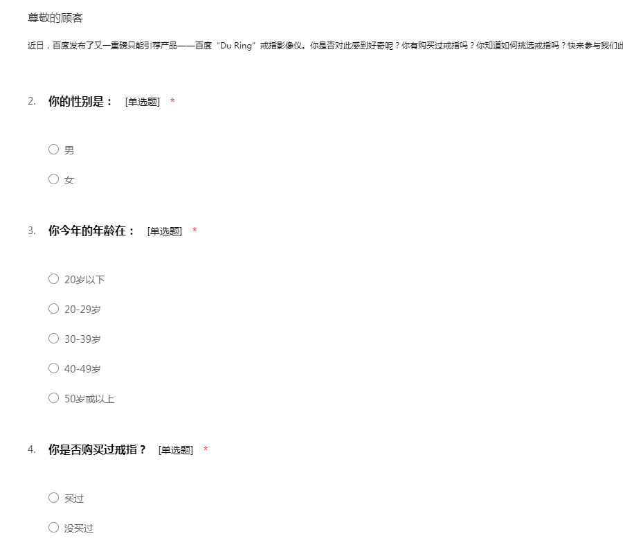 近日,百度发布了又一重磅只能引荐产品——百度“Du Ring”戒指影像仪。你是否对此感到好奇呢?你有购买过戒指吗?你知道如何挑选戒指吗?快来参与我们此次的问卷调查,把你的看法留下吧!