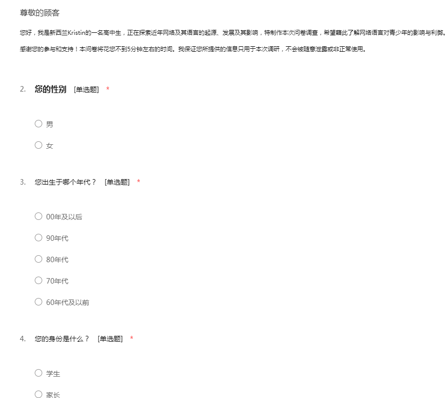 您好,我是新西兰Kristin的一名高中生,正在探索近年网络及其语言的起源、发展及其影响,特制作本次问卷调查,希望藉此了解网络语言对青少年的影响与利弊。 感谢您的参与和支持!本问卷将花您不到5分钟左右的时间。我保证您所提供的信息只用于本次调研,不会被随意泄露或非正常使用。