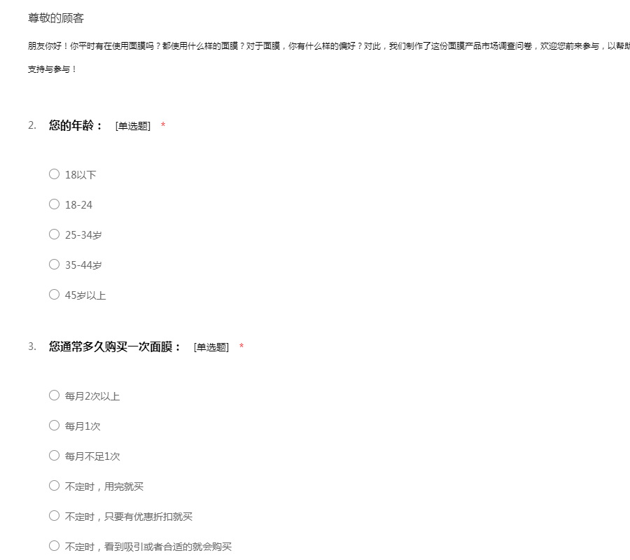 朋友你好!你平时有在使用面膜吗?都使用什么样的面膜?对于面膜,你有什么样的偏好?对此,我们制作了这份面膜产品市场调查问卷,欢迎您前来参与,以帮助我们了解面膜产品的市场状况。感谢您对我们的支持与参与!