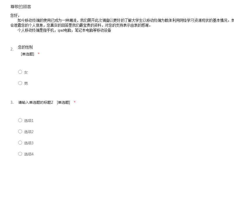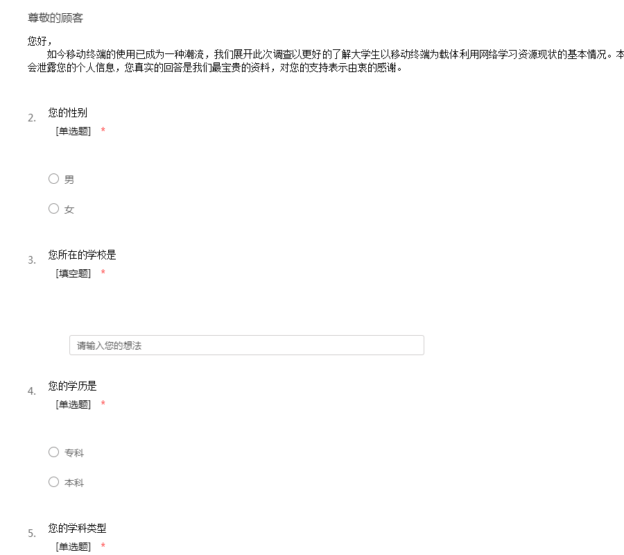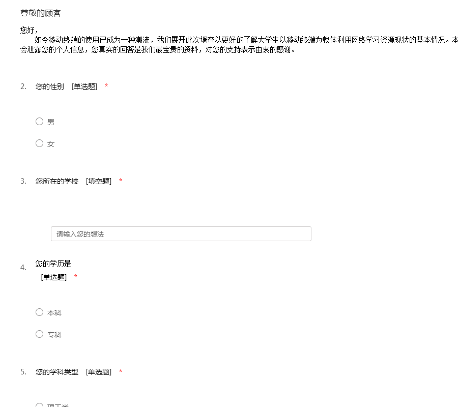 您好, 如今移动终端的使用已成为一种潮流,我们展开此次调查以更好的了解大学生以移动终端为载体利用网络学习资源现状的基本情况。本次问卷收集数据仅供调查分析使用,绝不会泄露您的个人信息,您真实的回答是我们最宝贵的资料,对您的支持表示由衷的感谢。
