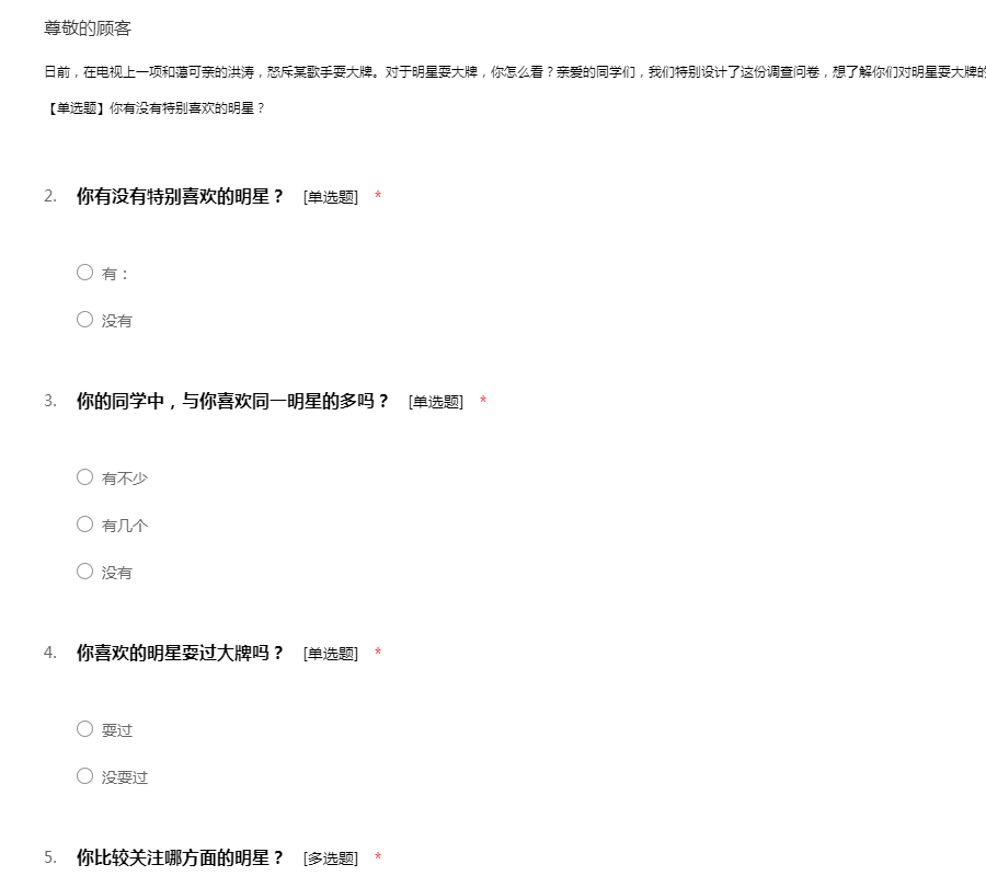 日前,在电视上一项和蔼可亲的洪涛,怒斥某歌手耍大牌。对于明星耍大牌,你怎么看?亲爱的同学们,我们特别设计了这份调查问卷,想了解你们对明星耍大牌的看法。问卷不记名,感谢你的积极参与! 【单选题】你有没有特别喜欢的明星?