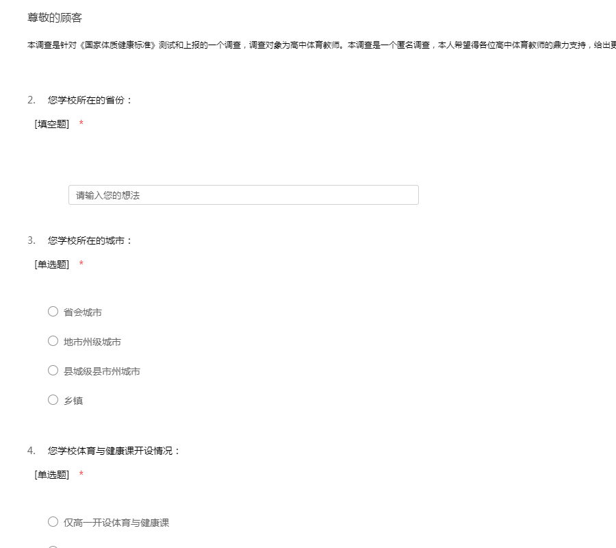 本调查是针对《国家体质健康标准》测试和上报的一个调查,调查对象为高中体育教师。本调查是一个匿名调查,本人希望得各位高中体育教师的鼎力支持,给出更为真实的结果。谢谢!