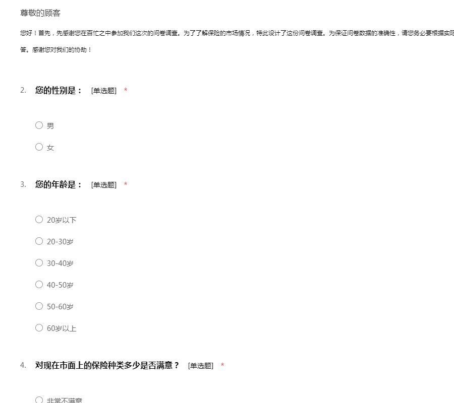 您好!首先,先感谢您在百忙之中参加我们这次的问卷调查。为了了解保险的市场情况,特此设计了这份问卷调查。为保证问卷数据的准确性,请您务必要根据实际情况来填写。问卷采用你明知,所以请放心填答。感谢您对我们的协助!