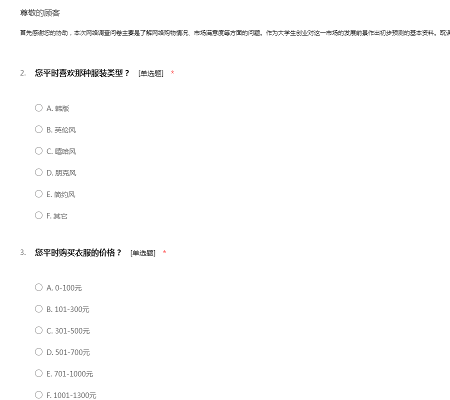 首先感谢您的协助,本次网络调查问卷主要是了解网络购物情况、市场满意度等方面的问题。作为大学生创业对这一市场的发展前景作出初步预测的基本资料。耽误了您的宝贵时间,望请见谅。