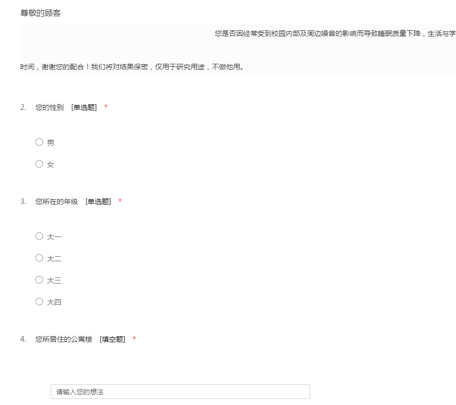您好!欢迎参加“陇东学院校园噪音污染”的调查工作!您是否因经常受到校园内部及周边噪音的影响而导致睡眠质量下降,生活与学习都受到了干扰?噪音是影响大学生睡眠和学习质量的主要问题之一,本次调查的目的在于了解学校内部及周边的噪音对大学生的影响情况,以此提出意见或建议,为学生营造一个良好的学习及生活环境。耽误您宝贵的几分钟时间,谢谢您的配合!我们将对结果保密,仅用于研究用途,不做他用。
