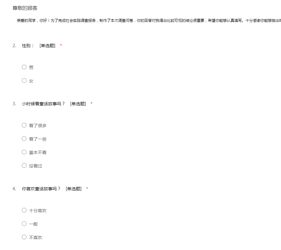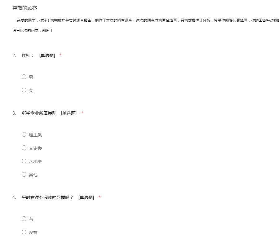 亲爱的同学,你好!为完成社会实践调查报告,制作了本次的问卷调查,这次的调查均为匿名填写,只为数据统计分析,希望你能够认真填写,你的回答将对我的分析有很大的作用,十分感谢你能够抽出时间填写此次的问卷,谢谢!