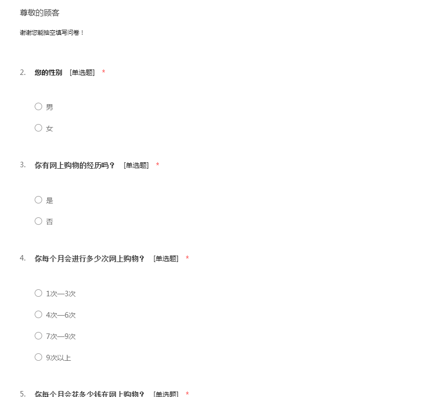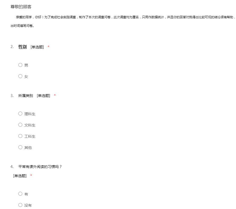 亲爱的同学,你好!为了完成社会实践调查,制作了本次的调查问卷,此次调查均为匿名,只用作数据统计,并且你的回答对我得出比较可观的结论很有帮助,希望能够按照你的真实情况填写,十分感谢你抽出时间填写问卷。