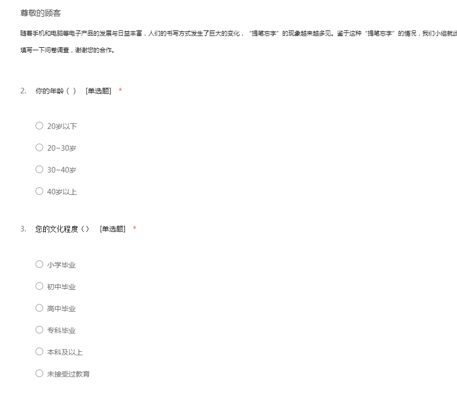 随着手机和电脑等电子产品的发展与日益丰富,人们的书写方式发生了巨大的变化,“提笔忘字”的现象越来越多见。鉴于这种“提笔忘字”的情况,我们小组就此展开调查。在此浪费您几分钟宝贵的时间帮我们填写一下问卷调查,谢谢您的合作。