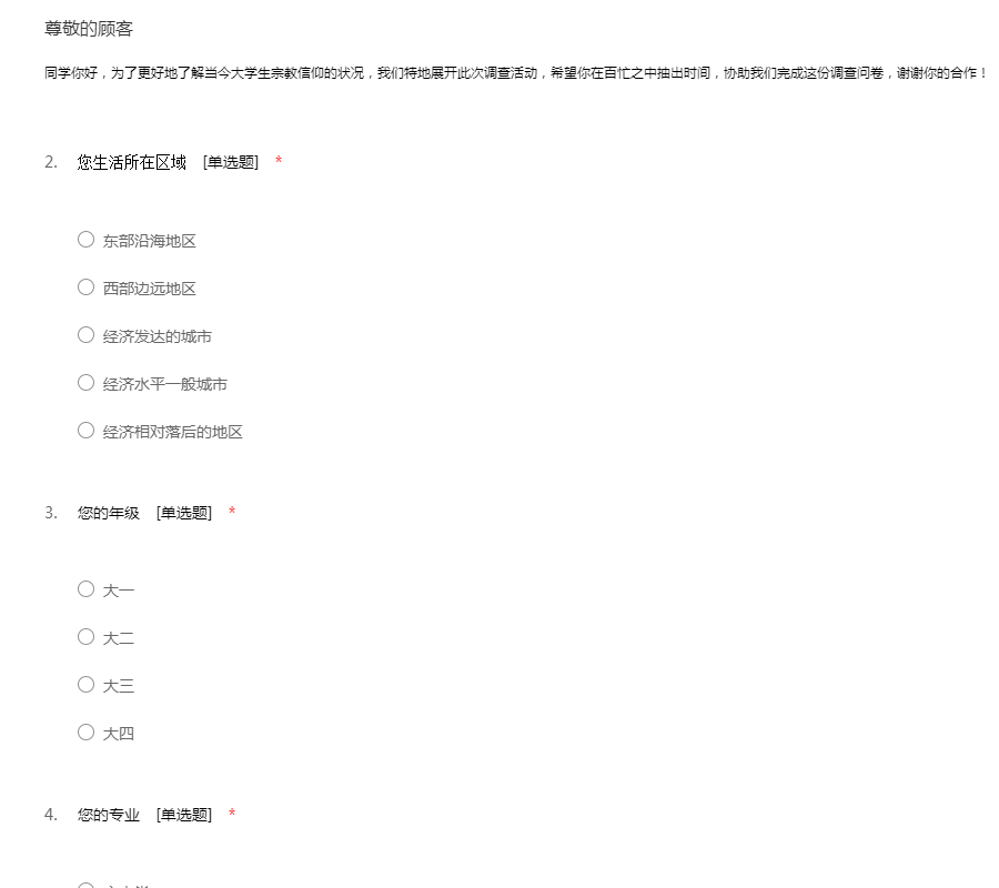 同学你好,为了更好地了解当今大学生宗教信仰的状况,我们特地展开此次调查活动,希望你在百忙之中抽出时间,协助我们完成这份调查问卷,谢谢你的合作!