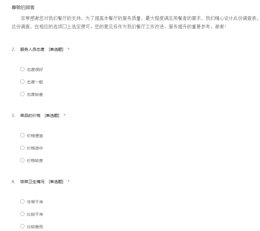 非常感谢您对我们餐厅的支持,为了提高本餐厅的服务质量,最大程度满足用餐者的需求,我们精心设计此份调查表,请抽出您宝贵的时间协助我们完成这份调查,在相应的选项□上选定便可。您的意见将作为我们餐厅工作改进、服务提升的重要参考。谢谢!