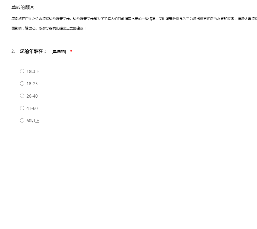 感谢您在百忙之余来填写这份调查问卷。这份调查问卷是为了了解人们目前消费水果的一些情况。同时调查数据是为了为您提供更优质的水果和服务,请您认真填写。且问卷采取不记名方式,不会对您造成任何负面影响,请放心。感谢您给我们提出宝贵的建议!