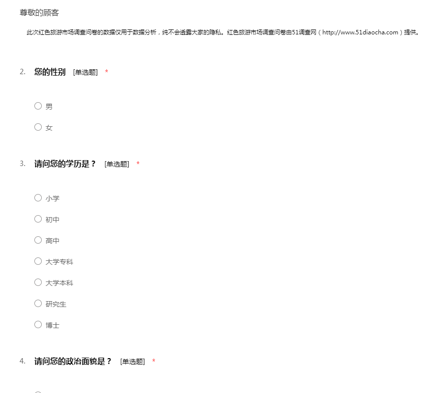此次红色旅游市场调查问卷的数据仅用于数据分析,纯不会透露大家的隐私。红色旅游市场调查问卷由51调查网(http://www.51diaocha.com)提供。