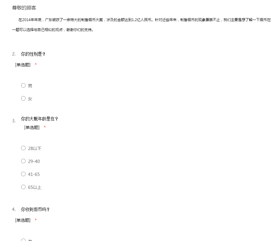 在2014年年底,广东破获了一宗特大的制售假币大案,涉及的金额达到1.2亿人民币。针对近些年来,制售假币的现象屡禁不止,我们主要是想了解一下假币在我们生活中的流通情况,下面有一份题,针对每一题可以选择与自己相似的观点,谢谢你们的支持。