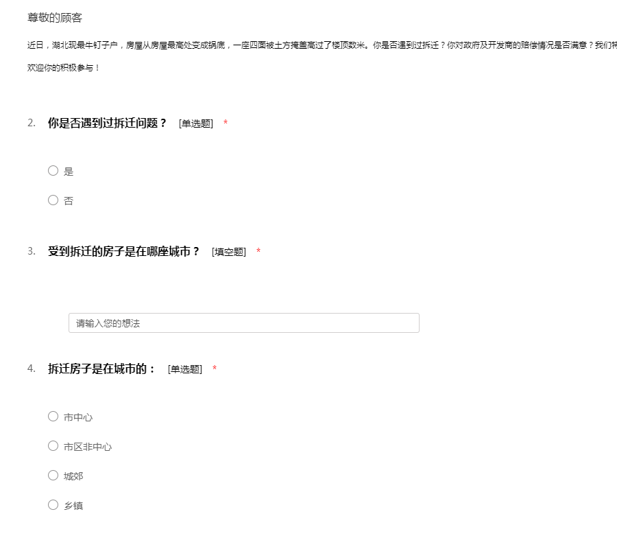 近日,湖北现最牛钉子户,房屋从房屋最高处变成锅底,一座四面被土方掩盖高过了楼顶数米。你是否遇到过拆迁?你对政府及开发商的赔偿情况是否满意?我们特别设计了这份关于拆迁赔偿的满意度调查问卷,欢迎你的积极参与!