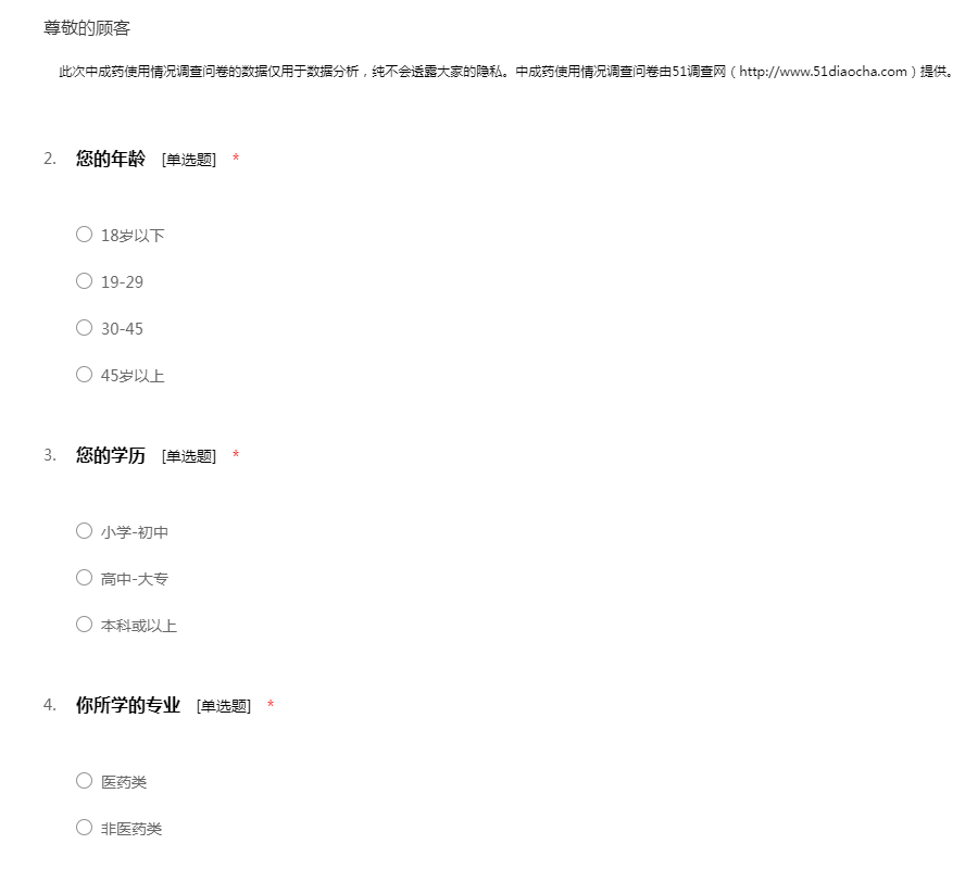 此次中成药使用情况调查问卷的数据仅用于数据分析,纯不会透露大家的隐私。中成药使用情况调查问卷由51调查网(http://www.51diaocha.com)提供。