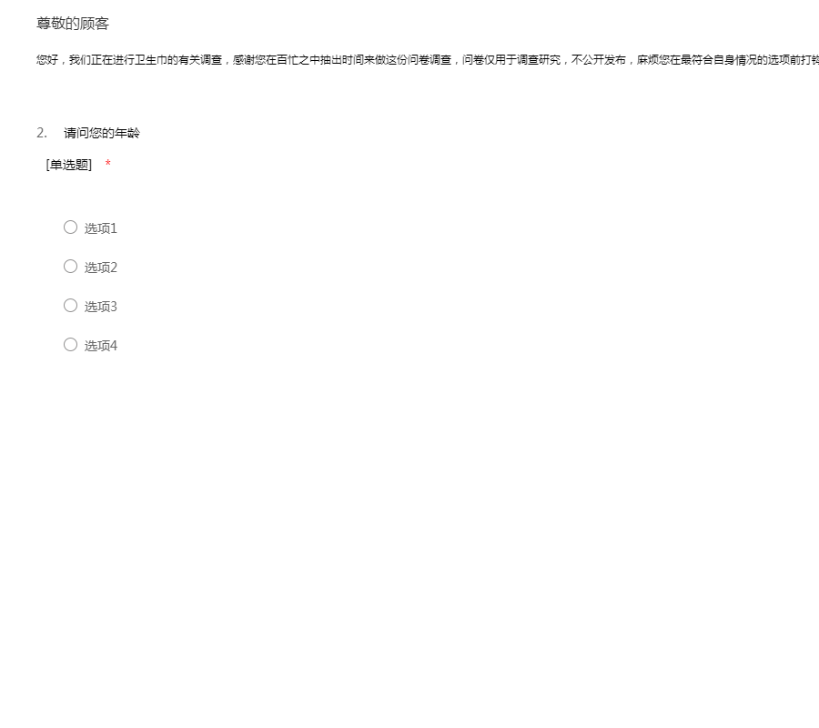 您好,我们正在进行卫生巾的有关调查,感谢您在百忙之中抽出时间来做这份问卷调查,问卷仅用于调查研究,不公开发布,麻烦您在最符合自身情况的选项前打钩