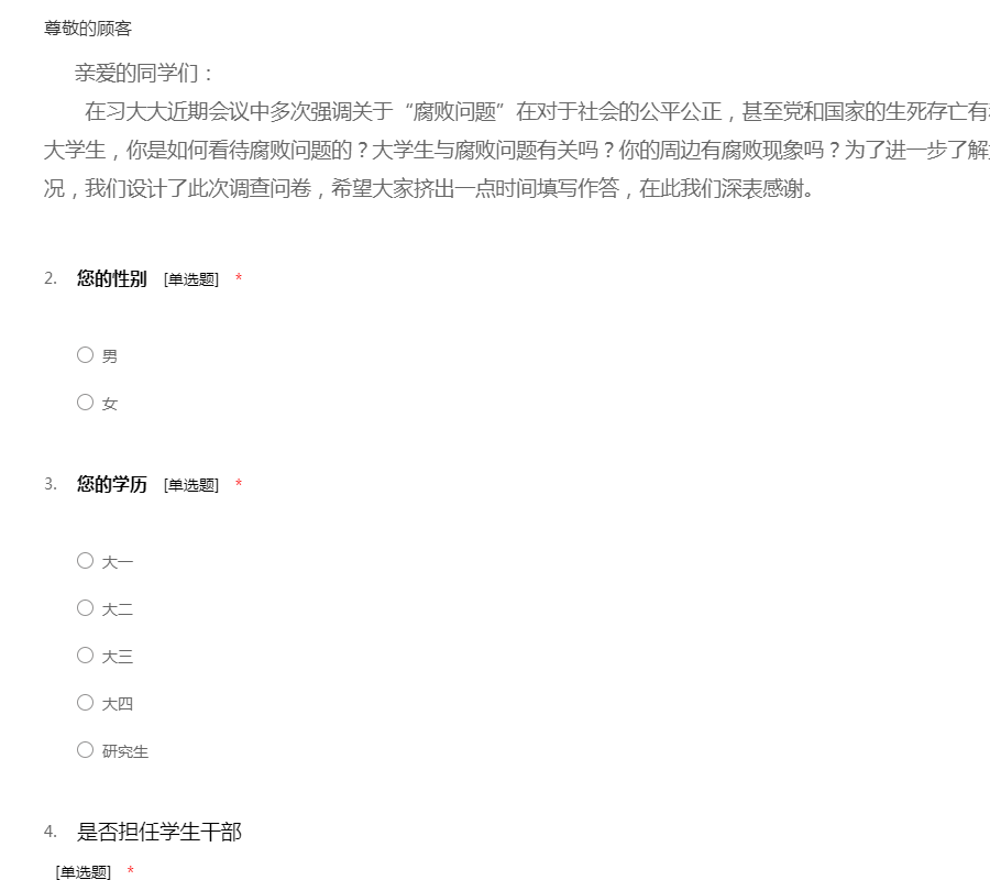 亲爱的同学们: 在习大大近期会议中多次强调关于“腐败问题”在对于社会的公平公正,甚至党和国家的生死存亡有着密不可分的联系。我们作为大学生,你是如何看待腐败问题的?大学生与腐败问题有关吗?你的周边有腐败现象吗?为了进一步了解大学生对腐败问题的认知情况,我们设计了此次调查问卷,希望大家挤出一点时间填写作答,在此我们深表感谢。