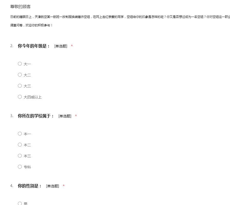 日前的睡眠日上,天津航空某一航班一改制服换装睡衣空姐,在网上走红亲爱的同学,空姐给你的印象是怎样的呢?你又是否想过成为一名空姐?你对空姐这一职业又是如何看待的呢?在此,我们特别设计了这份调查问卷,欢迎你的积极参与!