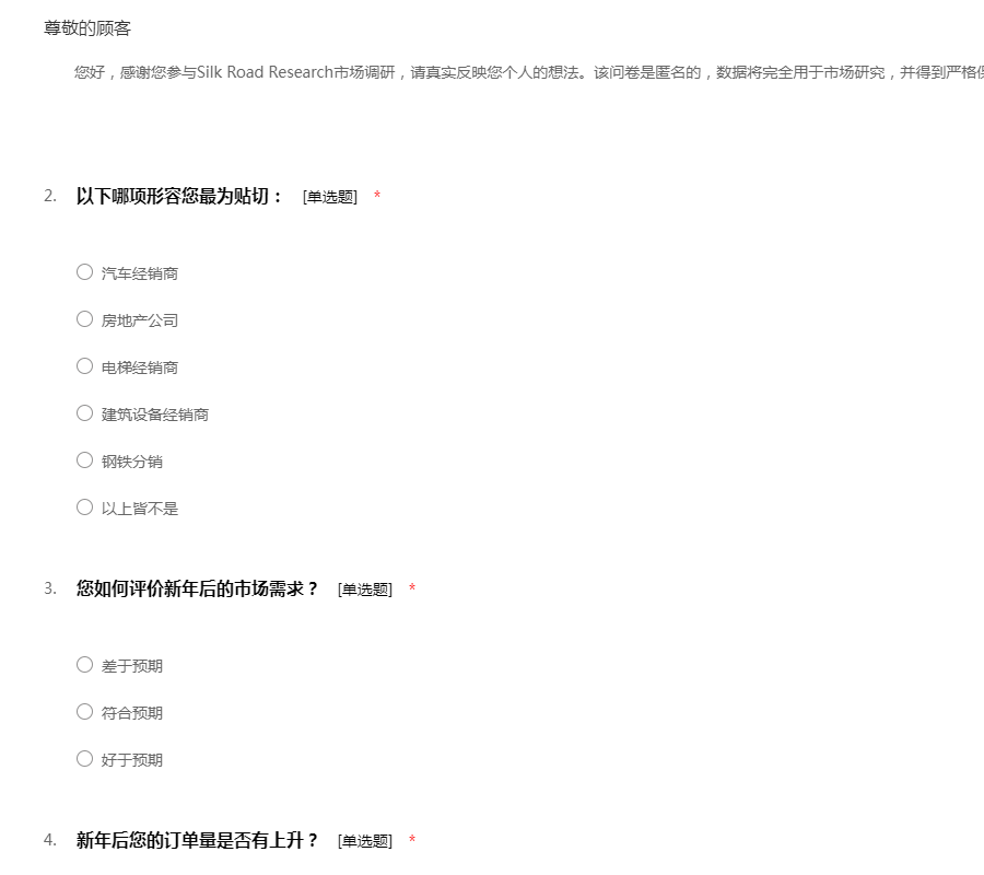 您好,感谢您参与Silk Road Research市场调研,请真实反映您个人的想法。该问卷是匿名的,数据将完全用于市场研究,并得到严格保密。