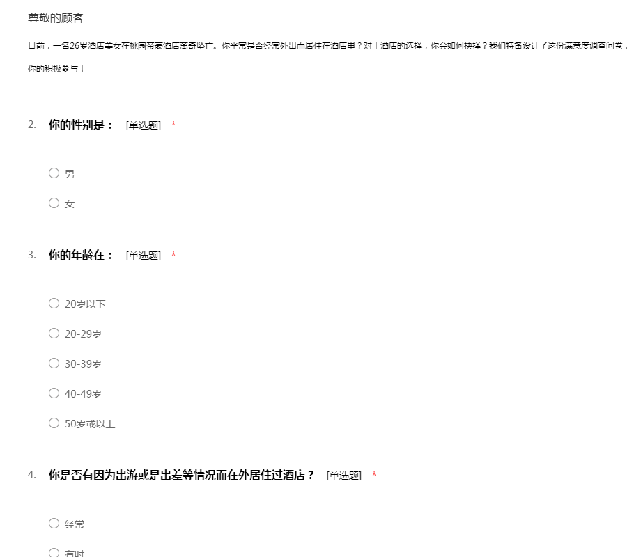 日前,一名26岁酒店美女在桃园帝豪酒店离奇坠亡。你平常是否经常外出而居住在酒店里?对于酒店的选择,你会如何抉择?我们特备设计了这份满意度调查问卷,希望能够了解到你的看法。问卷不记名,感谢你的积极参与!